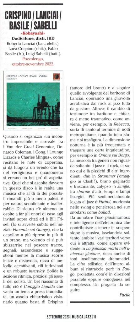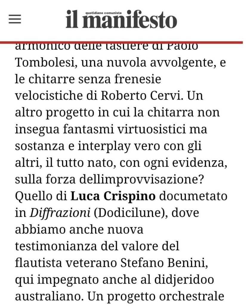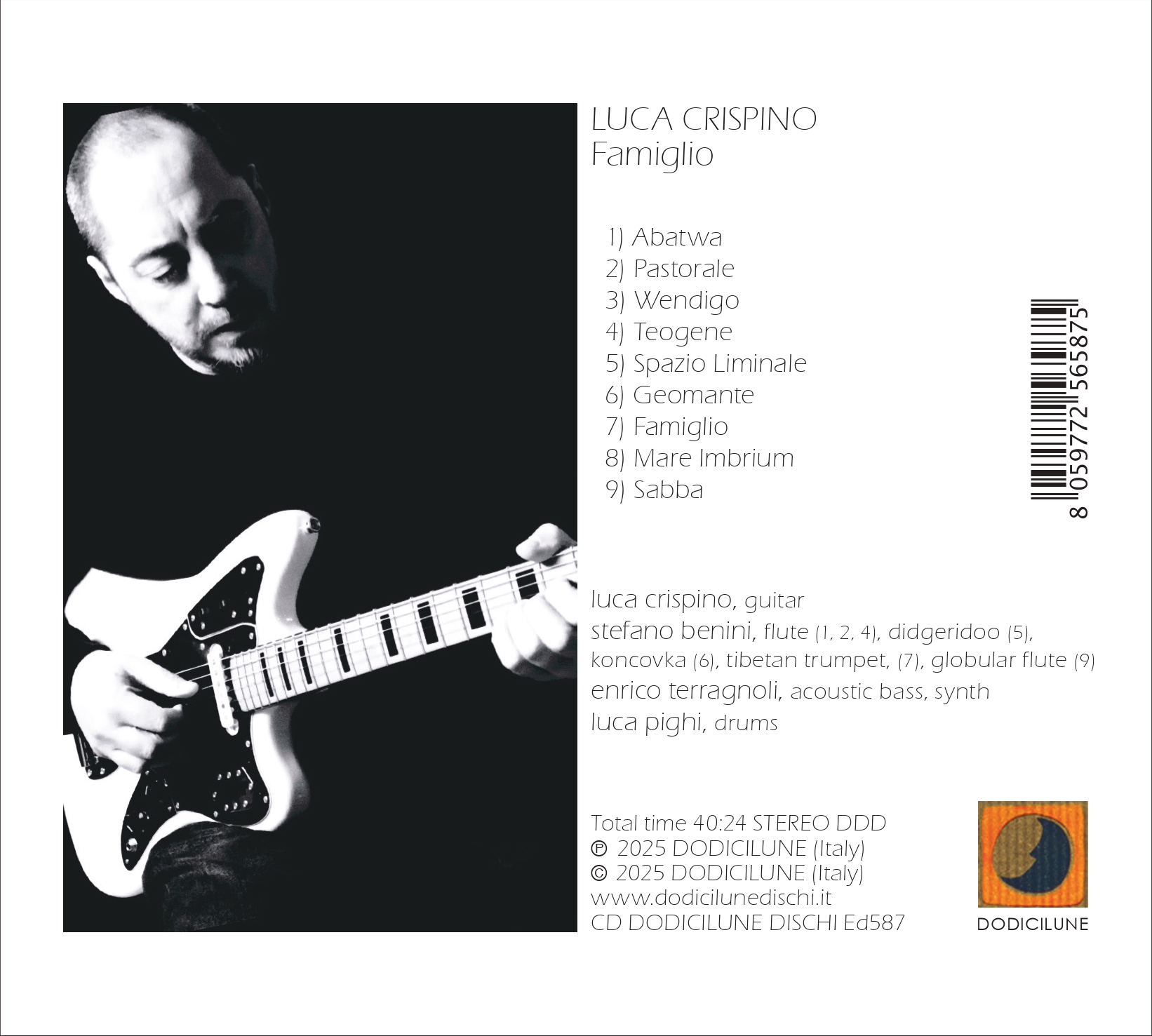 Luca Crispino è un chitarrista e compositore musicalmente versatile ma strettamente ancorato alla tradizione jazz di cui ha esteso i confini seguendo il suo istinto di improvvisatore creativo ed originale. Dagli inizi della sua carriera ad oggi ha avuto modo di partecipare ad interessanti progetti di fusione tra i generi coltivando sempre più la sua attenzione verso lo studio, la pratica e la natura dell’improvvisazione musicale. Dal 2000 esercita la professione artistica esibendosi dal vivo in varie formazioni e partecipando ad importanti rassegne musicali e festival nazionali. Sempre dallo stesso anno inizia a dedicarsi all’insegnamento e allo studio della musica sperimentale. Nel 2013 si trasferisce a Verona dove è tra i creatori del Centro di Formazione Musicale Moderna Artingegno. Collabora attivamente con diversi artisti ed ensemble, operando in produzioni discografiche ed esibizioni live. Ad oggi Luca Crispino alterna la sua attività di musicista, sia sul palco che in studio, alla didattica ed alla ricerca musicale.